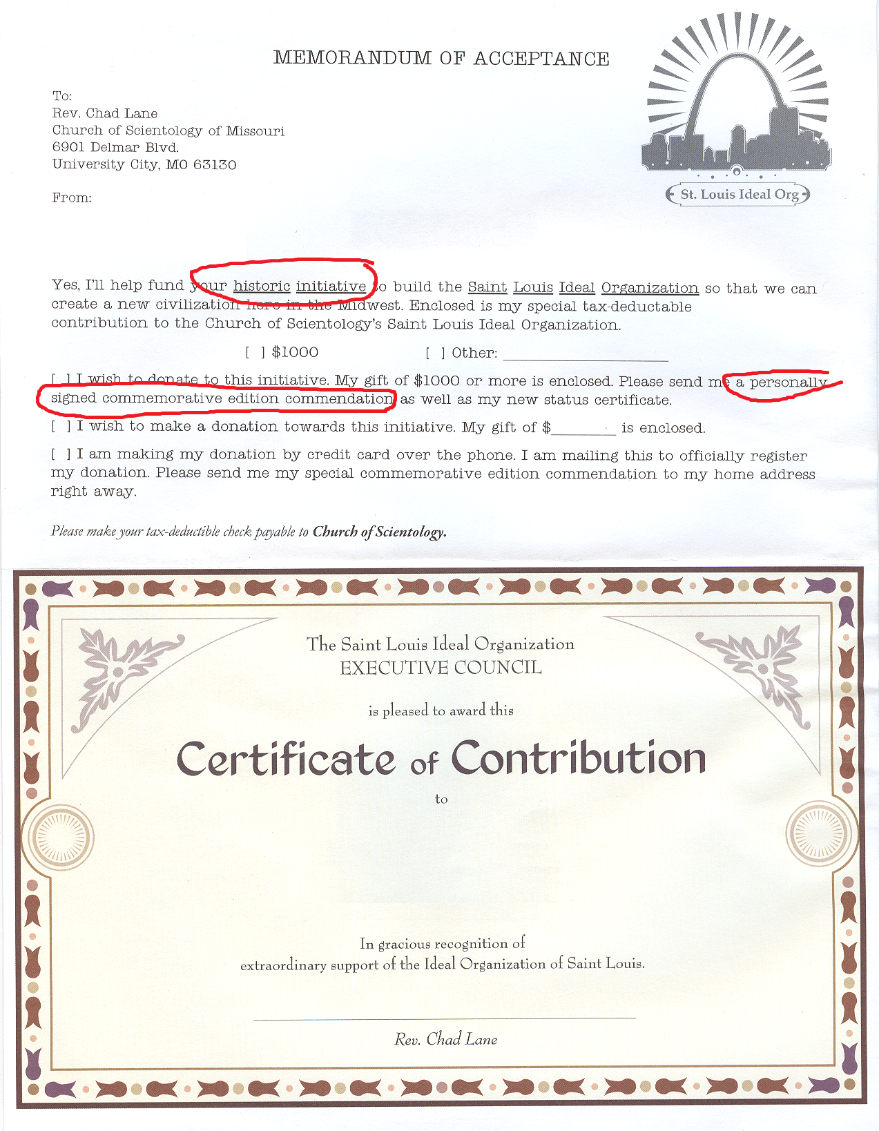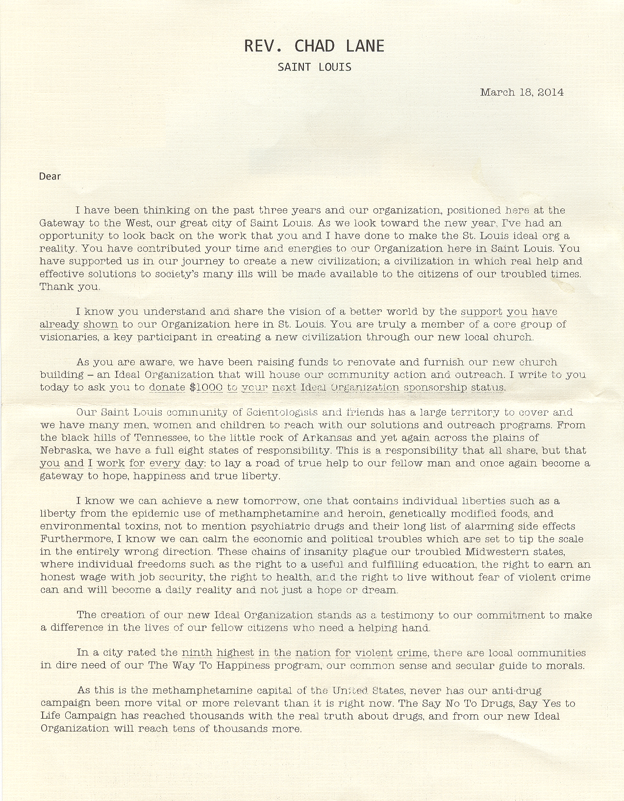 The quality of requesting donations seems to be going downhill.. I think this is because donations in general are rapidly going downhill and they will take ANYONE’S advice about how to get donations up. Of course, they can’t go back to successful LRH policy actions because he didn’t suggest ripping off money from parishioners in return for nothing.
